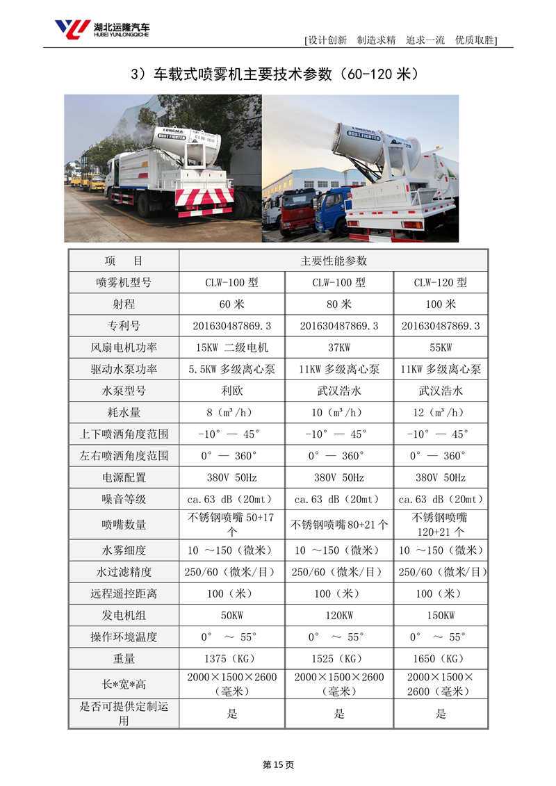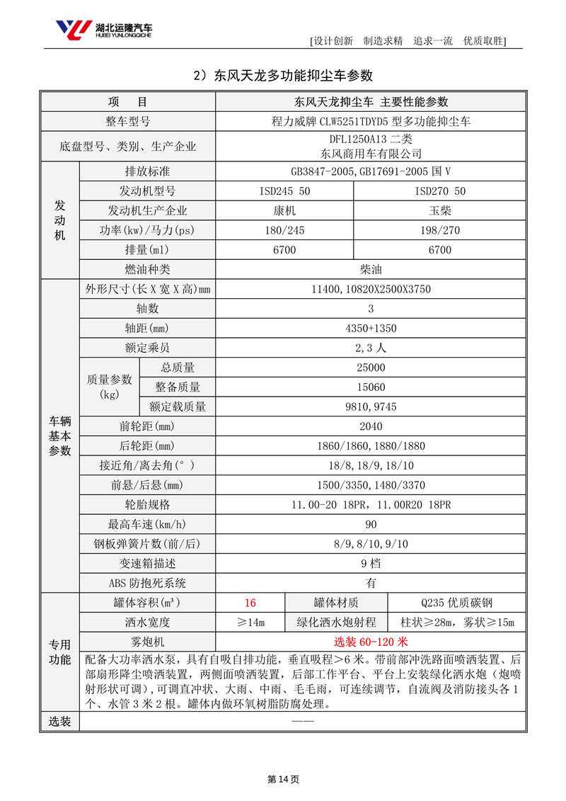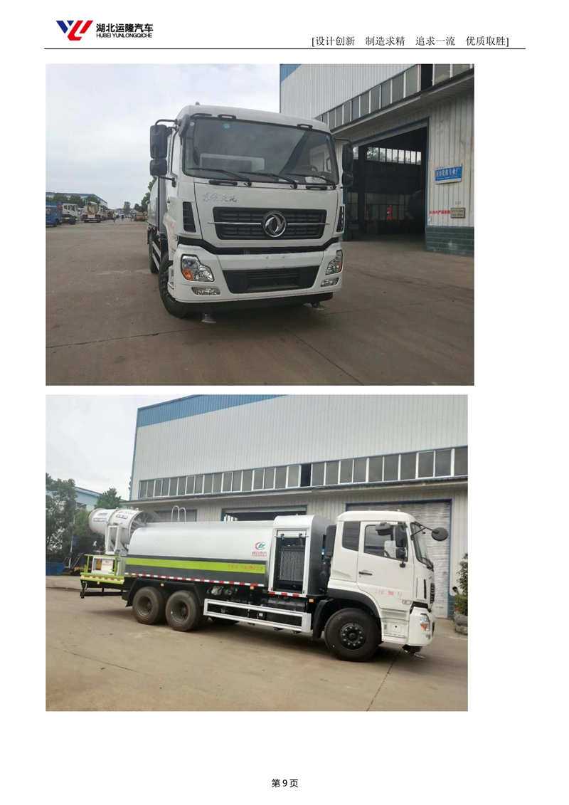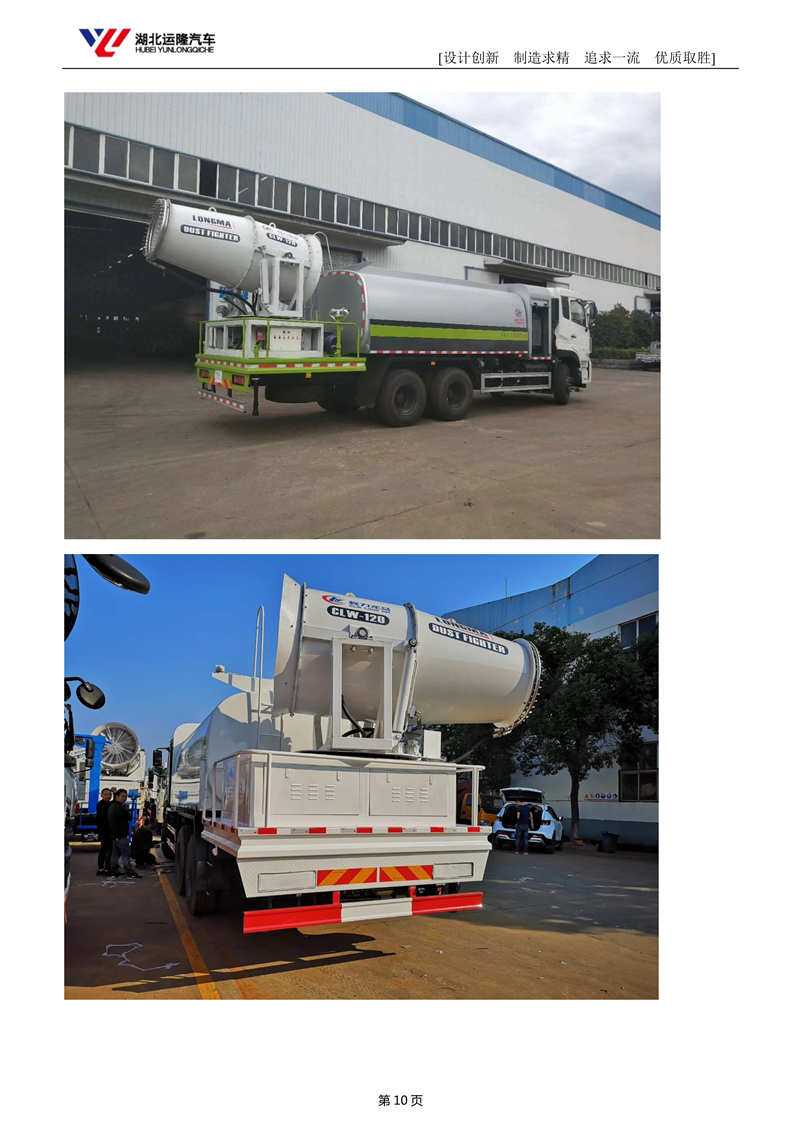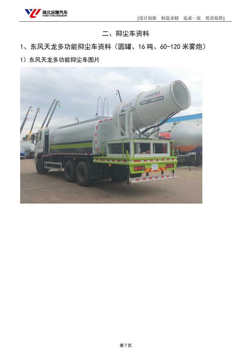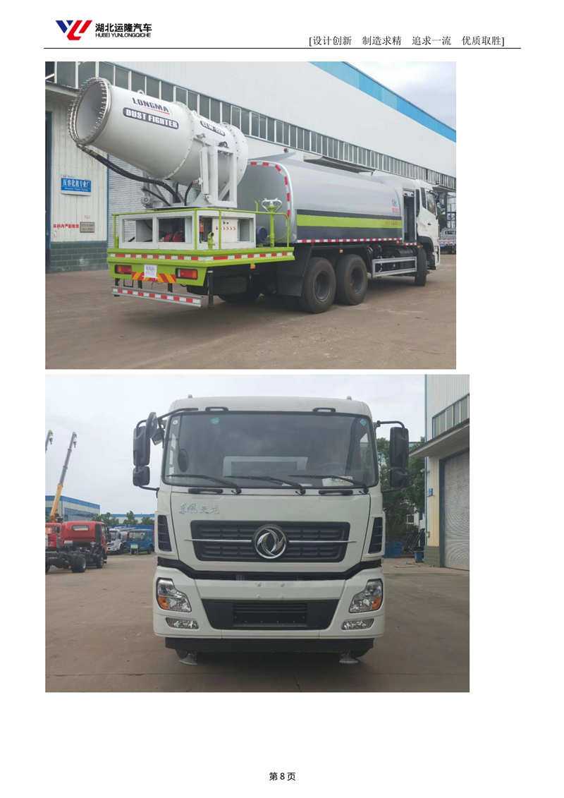 上裝配置:罐體容積為 15-18 立方多功能抑塵灑水車,選配風送式霧炮機組射程50米、60米、80米、100米、120米,罐體鋼板為4mm碳鋼Q235材質,罐內隔板具有防波作用,以減輕汽車行駛時罐體液體沖擊,罐體及整車外形尺寸按照公告。帶大功率專用灑水泵,泵可自吸自排,整車前沖、后灑、側噴、帶65消防接口,后平臺配CLW-50、CLW-60、CLW-80、CLW-100、CLW-120型風送式霧炮機組;罐體前封頭配大功率柴油發電機組;遠程遙控系統控制;霧炮機自動旋轉角度0-360°后平臺帶綠化灑水炮,灑水炮可全方位旋轉,可連續調成直沖狀、大雨、小雨、毛毛雨;前封頭帶水位計,后平臺主管路帶1寸澆花接口,后爬梯帶兩根輸水管及陰陽端。罐體顏色:銀/灰/綠,罐體兩側噴“多功能抑塵車”字樣,貼反光標示